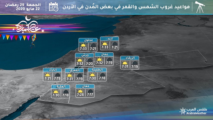 طقس العرب - تتحرى الأردن هلال شهر شوال، مساء يوم الجمعة 29 رمضان، لتحديد ما إذا كان يوم السبت هو المتمم لشهر رمضان، أم أنه سيكون أول أيام عيد الفطر السعيد.