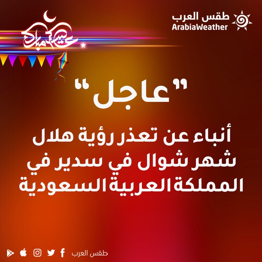 قالت المحكمة العليا بالسعودية بأن يوم غدٍ السبت هو المتمم لشهر رمضان، وأن يوم الأحد هو أول أيام عيد الفطر السعيد، وذلك بعد تعذر الرؤية الشرعية في لجان التحري الرسمية هذه الليلة.