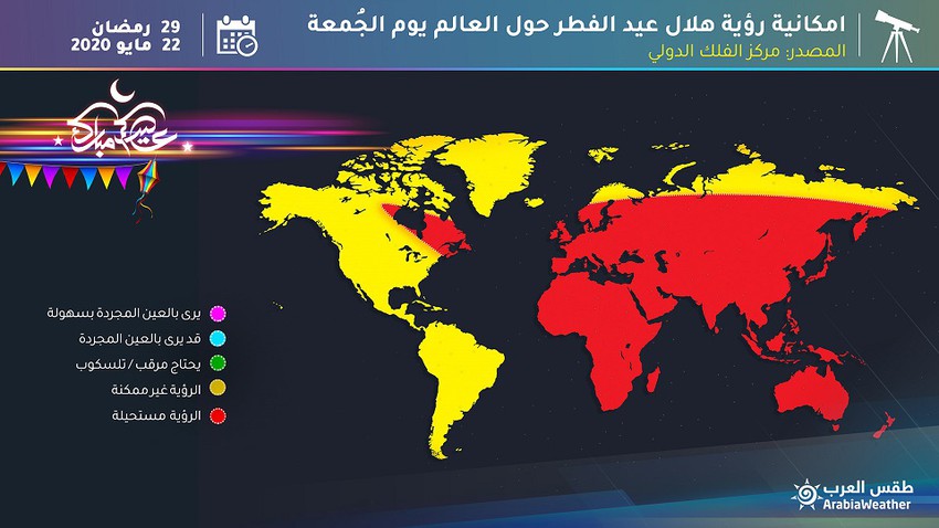 وتُشير الحسابات الفلكية لدينا في طقس العرب إلى أن رؤية هلال شهر شوال بعد مغيب شمس يوم الجمعة 29 رمضان ستكون مستحيلة، نظراً لعدم تولد هلال شهر شوال، حيث تشير الحسابات الفلكية إلى أن تولد الهلال سيكون في تمام الساعة 8:39 مساء الجُمعة بتوقيت الأردن، أي بعد مغيب الشمس، إضافة لغروب القمر قبل الشمس في مختلف مناطق الأردن والوطن العربي.. التفاصيل من هنا