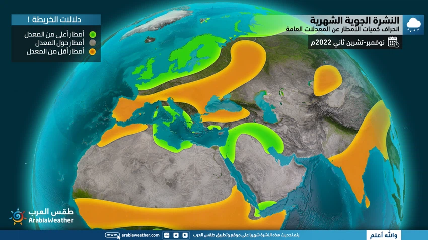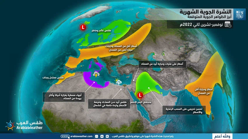 Météo de l'Arabie - Le bulletin mensuel pour la Jordanie pour le mois de novembre 2022 a été publié, qui rend compte des prévisions de chances favorables de pluie à certaines périodes et de temps automnal incliné vers le froid
