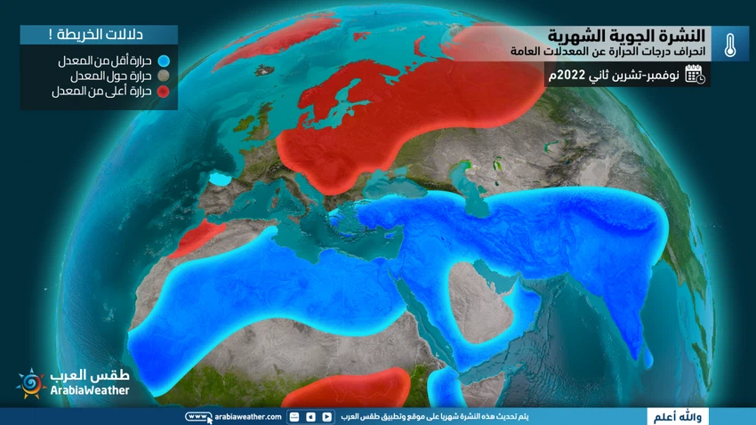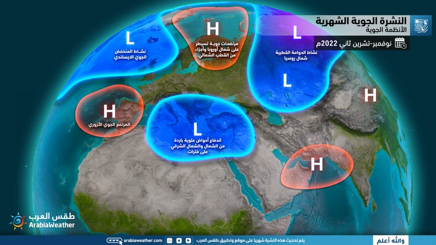 - Un anticyclone domine le nord du continent européen, s'étendant vers le sud et le sud-ouest de l'Europe, en conjonction avec une ruée vers des masses d'air froid dans le nord-ouest du continent et les îles britanniques, ce qui signifie l'extension de certaines masses d'air. Les détails sont disponible via le service d'abonnement distinctif pour le site Web et l'application Arab Weather à partir d' ici