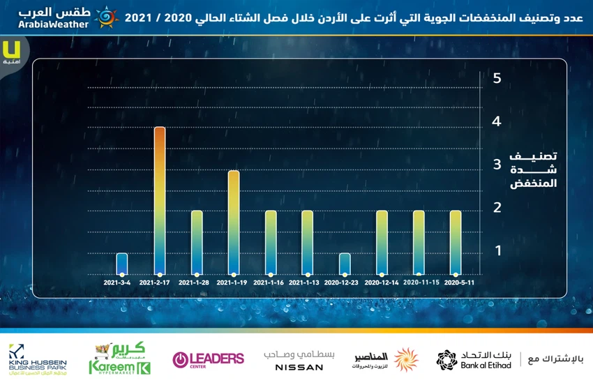 تأثرت المملكة خلال فصل الشتاء الحالي 2021/2020 بعشرة (10) منخفضات جوية توزعت كما يلي: