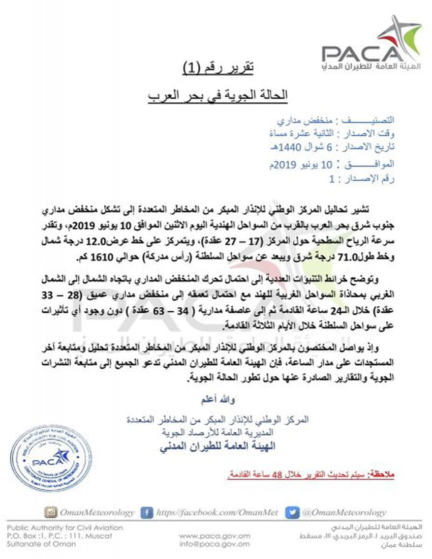 طقس العرب - سنان خلف - ضمن مراقتبها ومُتابعتها المستمرة لـ العاصفة المدارية في بحر العرب، أصدرت الهيئة العامة للأرصاد الجوية في سلطنة عُمان التقرير رقم 1 حول التأثيرات المُحتملة للعاصفة المدارية على السلطنة، وفيما يلي نص التقرير: