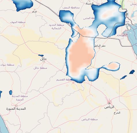 مع امتداد لمرتفع جوي من العراق نحو شمال شرق السعودية ليل الاثنين/الثلاثاء، يتوقع ان تخف سرعة الرياح و تنخفض درجات الحرارة السطحية، حيث تعمل هذه الظروف على تشكل الضباب في شرق حفر الباطن وأجزاء من جنوب الحدود الشمالية و شرق منطقتي حائل و القصيم، وتنخفض الرؤية الأفقية لتكون منعدمة في الطريق الرابط بين رفحاء وحفر الباطن.
