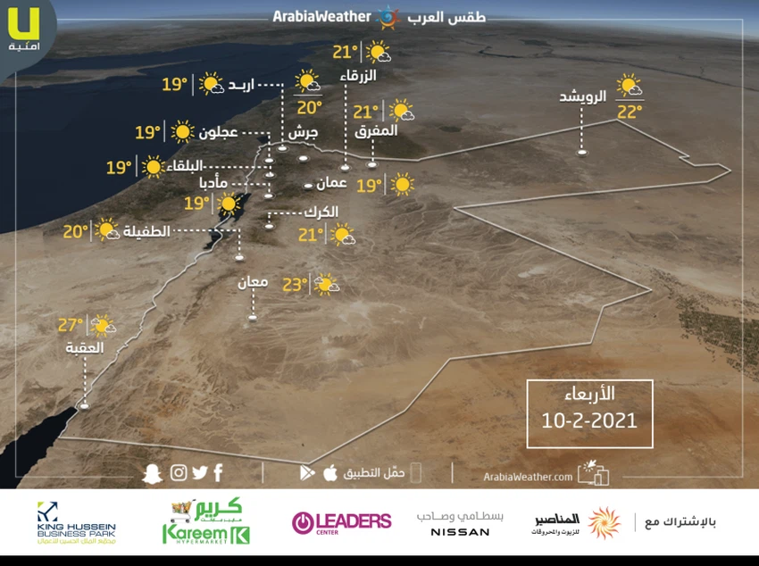 درجة الحرارة العظمى المتوقعة في الكرك: °21