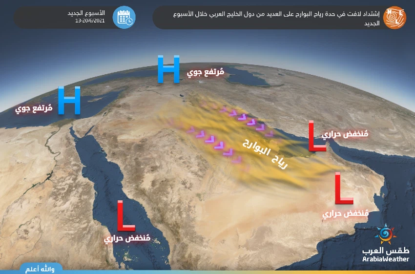 Météo arabe - les dernières sorties des modèles numériques reçus indiquent des attentes d'une augmentation significative de la vitesse des vents du nord-ouest, qui sont connus localement sous le nom de vents d'Al-Bawareh, tout au long des jours de la semaine en cours, en particulier à son début, provoquant la formation de vagues de poussière et de tempêtes de sable dans de nombreux pays du Golfe arabe, ce qui entraîne L'apparition d'une diminution de l'étendue de la vision horizontale, et peut-être son absence dans certains cas, en plus de l'apparition d'une montée et de turbulences dans les vagues de le golfe Persique.