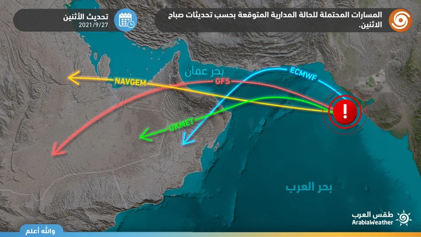 La dernière sortie des modèles météorologiques numériques traités par le Département des opérations aériennes indique le mouvement de l'état orbital « Jalab » avec le jour jeudi des terres indiennes vers le sud du Pakistan et plus tard vers la mer d'Arabie , où l'état tropical « Jalab » se développe à niveaux avancés selon les lectures des modèles numériques, ce qui place le Sultanat d'Oman et les Emirats Arabes Unis parmi ses voies probables.
