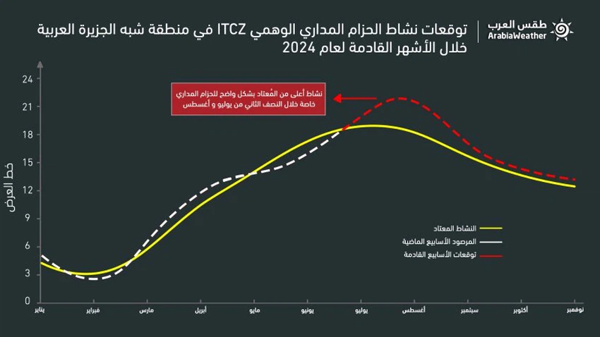 Selon les résultats des analyses météorologiques menées par les spécialistes d'Arabian Weather, on s'attend à ce que les risques de pluie dans plusieurs parties du sud de la péninsule arabique augmentent progressivement à mesure que le mois de juillet passe, avec la possibilité que les régions du sud-ouest du Royaume de l'Arabie Saoudite, surtout pendant la seconde moitié du mois, sera exposée à des précipitations. Des vagues d'humidité entraîneront de fortes pluies, provoquant des écoulements importants vers les vallées et les récifs de ces zones, si Dieu le veut.
