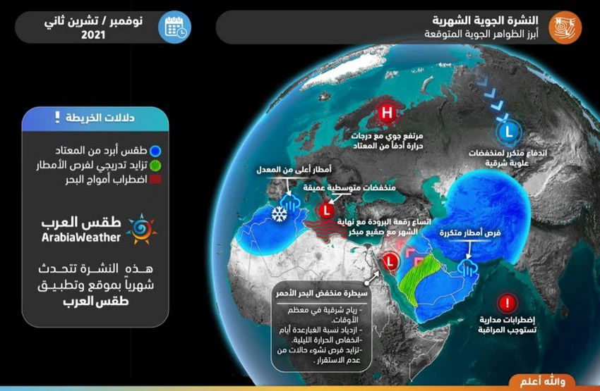 Météo arabe - Le personnel des prévisions météorologiques du "Centre météorologique régional arabe" a mis en garde dans son bulletin mensuel de l'augmentation de la concentration de poussière dans l'atmosphère du Royaume pendant plusieurs jours en novembre, en raison de la profondeur de la dépression de la mer Rouge en l'atmosphère de la région.