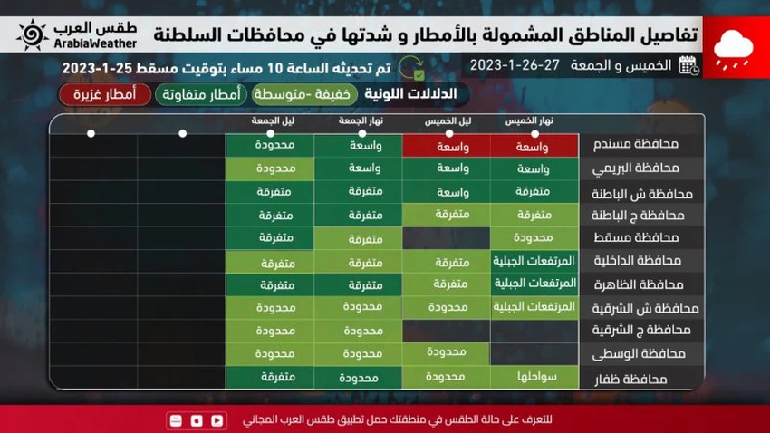 L'illustration ci-dessous montre les zones couvertes par la pluie et son intensité dans les gouvernorats du Sultanat durant jeudi et vendredi, si Dieu le veut.