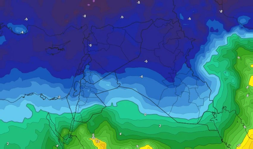 L'effet de la masse d'air très froide s'accentue dans la nuit de samedi à dimanche, ce qui entraîne une chute brutale des températures dans toutes les régions, pour être inférieures à zéro degré Celsius dans les régions du nord et de l'ouest, et autour de 5 degrés dans la capitale, Bagdad. Le temps sera froid à très froid dans toutes les régions, avec possibilité de formation de gel et de gel dans les régions du nord et de l'ouest.