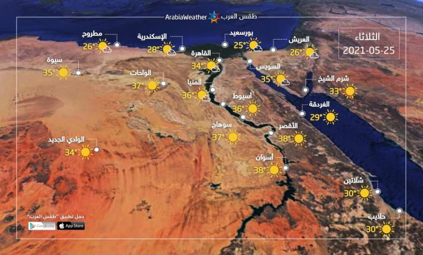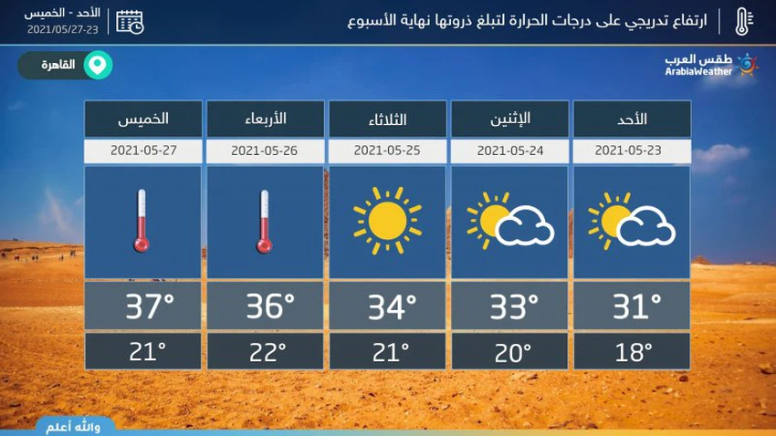 Cette augmentation est due à l'éruption d'une masse d'air plus chaude que d'habitude en provenance du sud de la péninsule arabique, qui travaille sur des températures élevées, car les températures maximales devraient atteindre 37-38 degrés Celsius à l'ombre du Caire, ce qui signifie que il augmentera avec l'influence du soleil.