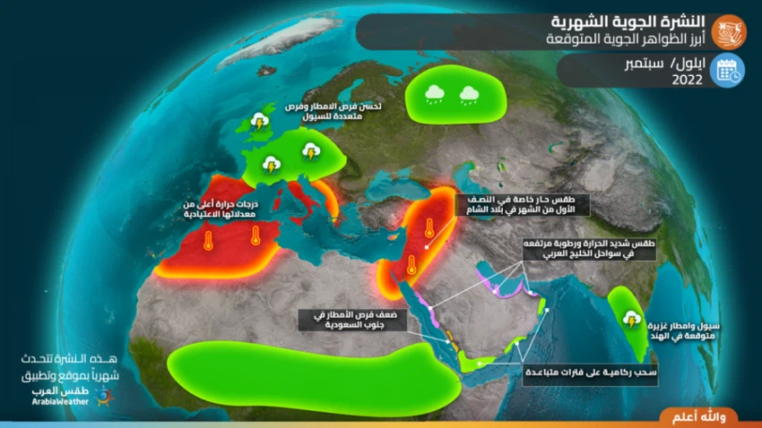 Météo arabe - Sinan Khalaf - L'équipe de prévision du Centre météorologique régional arabe s'attend à une baisse progressive de la sévérité du temps chaud sur le Royaume d'Arabie saoudite au cours de la seconde moitié de ce mois, en conjonction avec un net affaiblissement de l'air subtropical altitude en conjonction avec l'affaiblissement de la dépression thermique atmosphérique dans l'est de la péninsule arabique également, et les masses d'air moins chaudes (automne) commencent à s'écouler du bassin oriental de la mer Méditerranée vers les cieux du Levant, de l'Irak et du nord de l'Arabie saoudite. Saoudite.