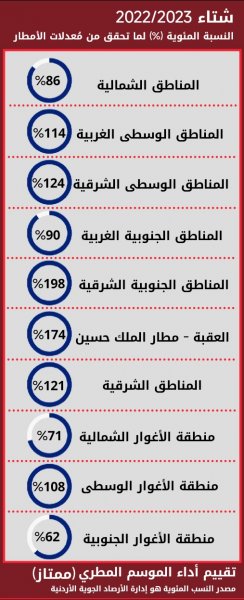 Remarque : La source du pourcentage des taux de saison des pluies atteints est le Département météorologique jordanien, et le reste des données archivées proviennent des données du Centre météorologique arabe.