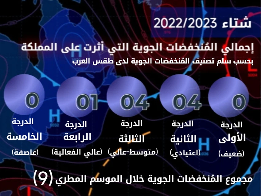La saison des pluies a débuté avec des conditions pluvieuses depuis le mois d'octobre, apportant du froid et de la pluie par périodes, mais depuis le début du carré d'hiver, le Royaume a connu une interruption des dépressions hivernales habituelles, malgré leur présence en Méditerranée. région, ils suivaient un chemin inhabituel à travers les terres égyptiennes et se déplaçaient rapidement. Vers le nord de l'Arabie Saoudite, et en raison de l'extension et du chevauchement d'une basse mer inhabituelle, le sud du Royaume en particulier et la région de Bawadi étaient exposés à de fortes des cas d'instabilité qui ont rendu la performance de la saison des pluies supérieure à la moyenne dans ces zones, tandis que les régions du nord et du centre ont souffert d'une faible performance de la saison des pluies jusqu'aux années cinquante de l'hiver au cours desquelles le comportement est revenu. la performance de la saison s'est modifiée dans le nord et le centre du Royaume, et malgré le début de saison faible, la saison des pluies s'est terminée par une excellente performance dans diverses régions, notamment celles du centre et du sud, avec de bonnes quantités de pluie, grâce à Dieu.