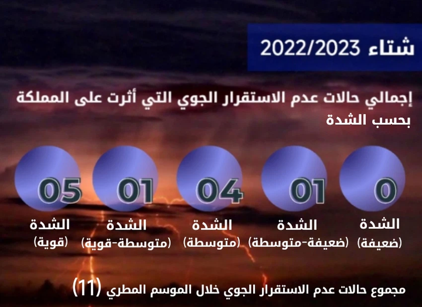 Mardi et mercredi, le Royaume a été touché par un état classé comme forte instabilité atmosphérique, suite à l'afflux d'une masse d'air froid et humide dans le bassin oriental de la mer Méditerranée, qui a provoqué la formation d'une dépression atmosphérique à l'ouest de l'île de Chypre, coïncidant avec l'extension de la dépression dite de la mer Rouge depuis le Royaume d'Arabie Saoudite et un afflux d'humidité. Dans les différentes couches de l'atmosphère, il y a eu une baisse significative des températures avec des averses de pluie tombant dans Ces averses ont été fortes, notamment dans le sud du Royaume, notamment dans la ville d'Aqaba, ce qui a entraîné l'écoulement de vallées et de récifs et la formation de torrents soudains.