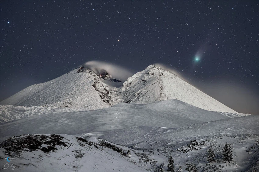 (Comète verte vue dans le ciel au-dessus de l'Etna enneigé en Sicile le 24 janvier 2023 - la montagne est un volcan actif comme en témoigne la fumée qui s'échappe des fumerolles. La comète ZTF montre à la fois une queue de poussière (pointant vers le haut) et un faible antipodal queue s'étendant dans la direction opposée - Photographe : Dario Gianobile (Source : skyandtelescope))
