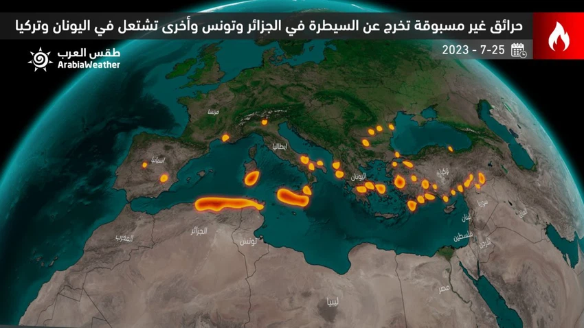 Coïncidant avec la hausse importante des températures et l'assèchement des sols et de la végétation, des incendies sans précédent se sont déclarés dans de nombreux pays du monde, concentrés dans les pays méditerranéens, dont la Tunisie, l'Algérie, la Turquie et la Grèce, et tuant au moins 34 personnes.