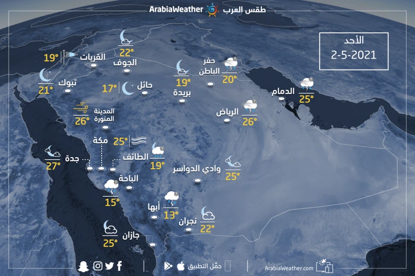 Les vents seront du nord-ouest, légers à modérés en vitesse, sur la plupart des régions, et ils sont actifs dans des parties limitées de la partie ouest du Royaume, alors qu'ils seront du sud-est à vitesse légère dans le sud du pays.