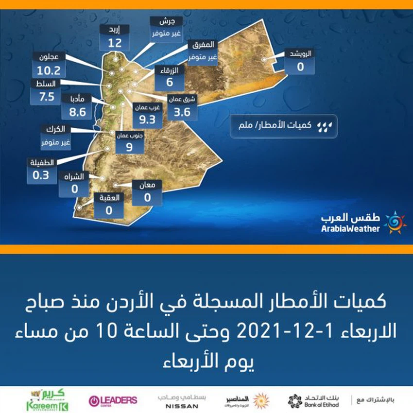 Météo arabe - voici les quantités de précipitations enregistrées depuis la matinée du mercredi 1-12-2021 jusqu'à 22h00 mercredi, selon les stations météorologiques arabes :