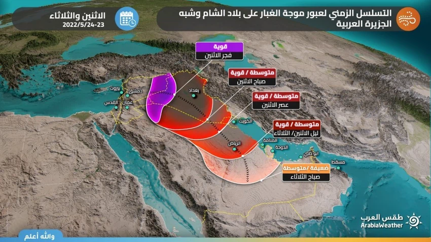 L'élargissement de l'onde de poussière et son extension vers Hafar Al-Batin à midi et lundi après-midi