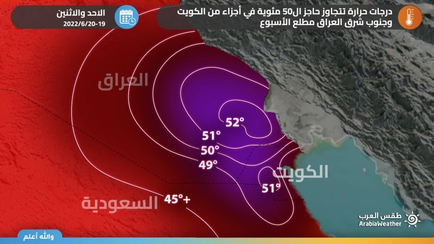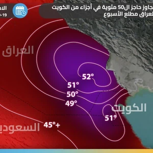 Après la volonté de Dieu, il est prévu que les températures maximales de samedi atteindront 50 degrés Celsius dans les régions du centre et du sud de l'Irak et à l'intérieur du Koweït, mais avec le début de la semaine prochaine, les températures seront d'environ 50 degrés Celsius dans le centre et le sud de l'Iraq comme une extension vers les parties intérieures du Koweït, et peut dépasser cela dans certaines parties, en particulier les villes de Basra et Jahra, en raison de l'emplacement du centre enflammé spécifiquement au-dessus de ces zones.
