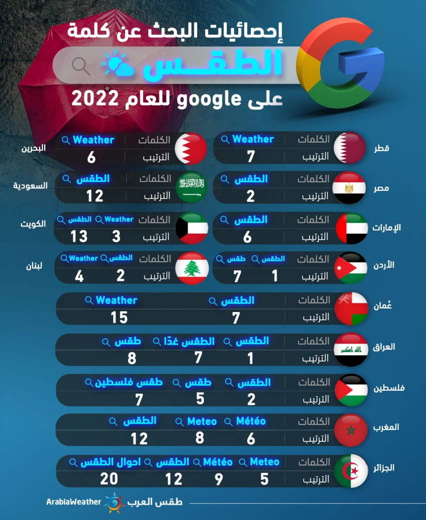 Le mot "météo" ou le mot "météo" arrive en tête de la liste des mots les plus recherchés sur le moteur de recherche Google dans la plupart des pays arabes, et se classe premier dans certains d'entre eux. Ci-dessous, nous passons en revue la disposition météo parmi les mots les plus recherchés sur Google dans les pays arabes.