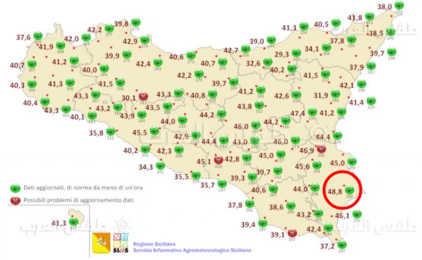 Météo arabe - Après le record des températures maximales pour aujourd'hui, mercredi 11/8/2021, l'île italienne de Sicile a enregistré une température de 48,8 degrés Celsius, qui est la température la plus élevée jamais enregistrée dans l'histoire des records climatiques pour le continent européen , dépassant le record enregistré il y a environ 40 ans dans la capitale grecque Athènes de 48 degrés Celsius.