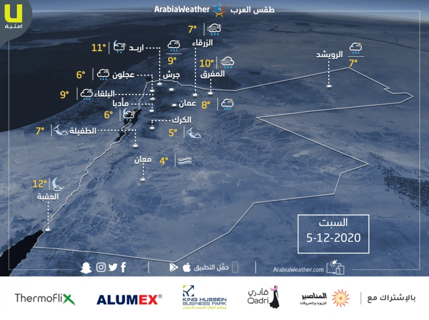 طقس العرب - تبقى فرص الأمطار الرعدية قائمة في ساعات الليل الأولى، ثم تتراجع تأثيرات حالة عدم الاستقرار الجوي و تضعف فرص الهطول مع ساعات الليل المتأخرة، ويكون الطقس بارداً ورَطِباً للغاية في مناطق واسعة من المملكة، مع تشكل الضباب بُعيد مُنتصف الليل في أجزاء واسعة من البلاد، وتدني كبير لمدى الرؤية الأفقية خاصة في الطرق الصحراوية و الخارجية، بما فيها منطقة مطار الملكة علياء الدولي.