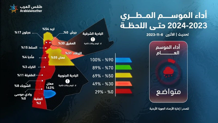 Alors que nous entrons dans la deuxième semaine de novembre de cette année (2023), les données du Département météorologique jordanien ont montré que le pourcentage de ce qui a été réalisé au cours de la saison jusqu'à présent ne s'élève qu'à 1 %, tandis que les mêmes données indiquent que la performance du saison des pluies Il n'a pas dépassé 25% par rapport aux quantités de pluie censées tomber pour cette période de l'année, car ce pourcentage est censé dépasser 90% dans des conditions normales dans de nombreuses régions. De plus, les températures enregistrent encore plusieurs degrés au-dessus de leurs niveaux habituels depuis le début de ce mois, et ont même approché les 30 degrés Celsius dans l'est de la capitale certains jours, et on s'attend à ce que ces conditions, qui peuvent être décrites aussi chaud, se poursuivra au cours des prochains jours.