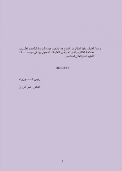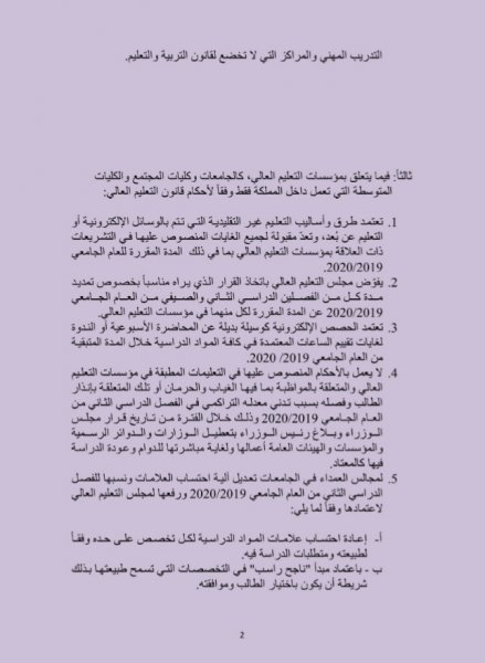 حيث يختص امر الدفاع رقم 7 بتنظيم التعليم المدرسي والجامعي والتدريب المهني عن بعد وآليات تقييم الطلبة - وتاليًا تفاصيل أمر دفاع رقم 7