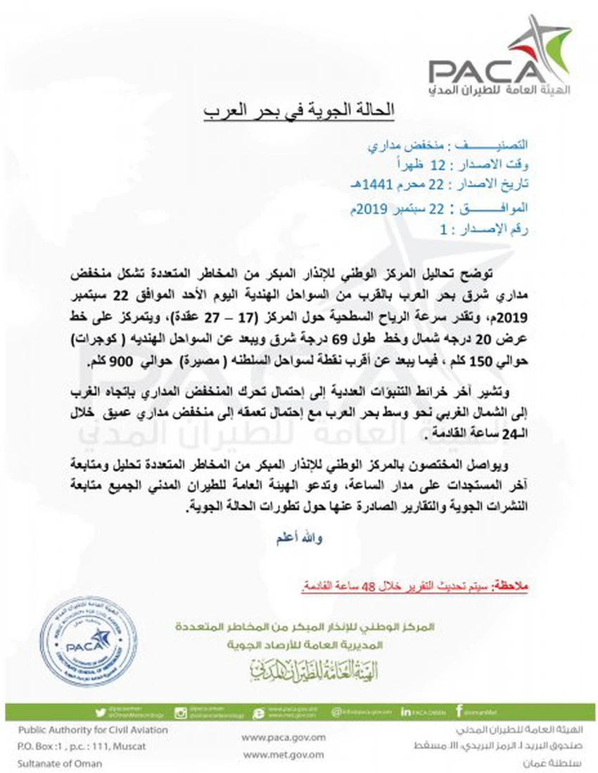 طقس العرب - ضمن مراقتبها ومُتابعتها المستمرة للحالة المدارية في بحر العرب، أصدرت الهيئة العامة للأرصاد الجوية في سلطنة عُمان التقرير رقم 1 حول آخر تطورات الحالة المدارية والتوقعات للساعات القادمة، وفيما يلي نص التقرير: