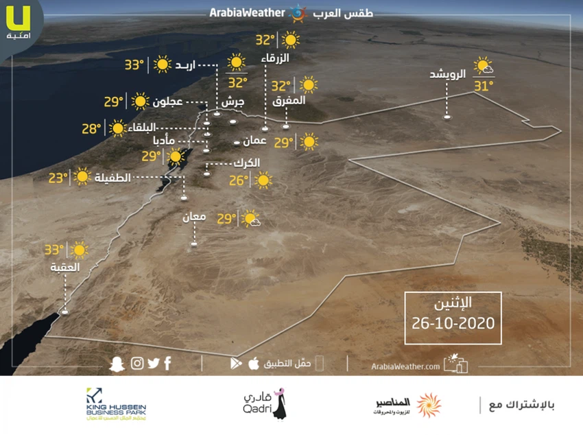درجة الحرارة العظمى المتوقعة في الكرك: °26