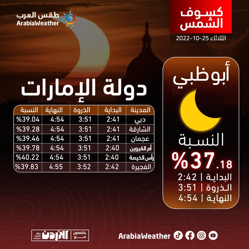 L'éclipse débutera mardi à Abou Dhabi à 14h42 et atteindra son maximum à 15h51 lorsque la lune couvrira 37,18 % du disque solaire. Après cela, l'éclipse commencera à s'estomper progressivement et la partie l'éclipse se termine à 16h54. . Lorsque le dernier contact apparent se produit entre le disque de la lune et le disque du soleil, l'événement entier dure environ deux heures et 12 minutes.