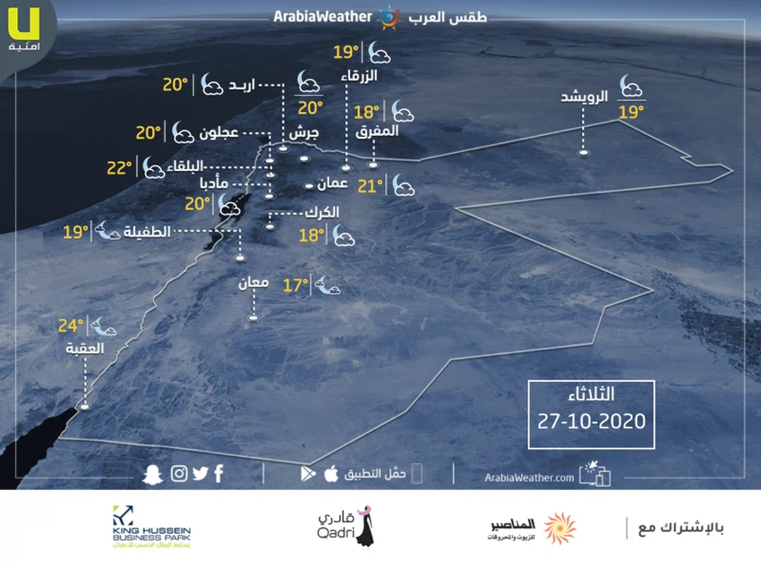 درجة الحرارة العظمى المتوقعة في عجلون: °27