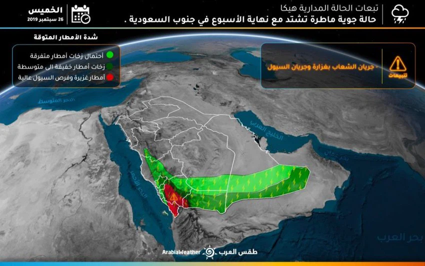 طقس العرب – م. ناصر حداد – تشير التوقعات الى تشكل حالة جوية ماطرة تشمل مناطق عديدة من جنوب وغرب السعودية، تبدأ الأربعاء 25 سبتمبر وتشتد مع نهاية الأسبوع بمشيئة الله.