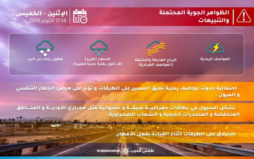 كما تترافق بنشاط كبير للرياح السطحية التي يُتوقع أن تتسبب بحدوث عواصف رملية محلية الطابع و تحد من مدى الرؤية الأفقية.