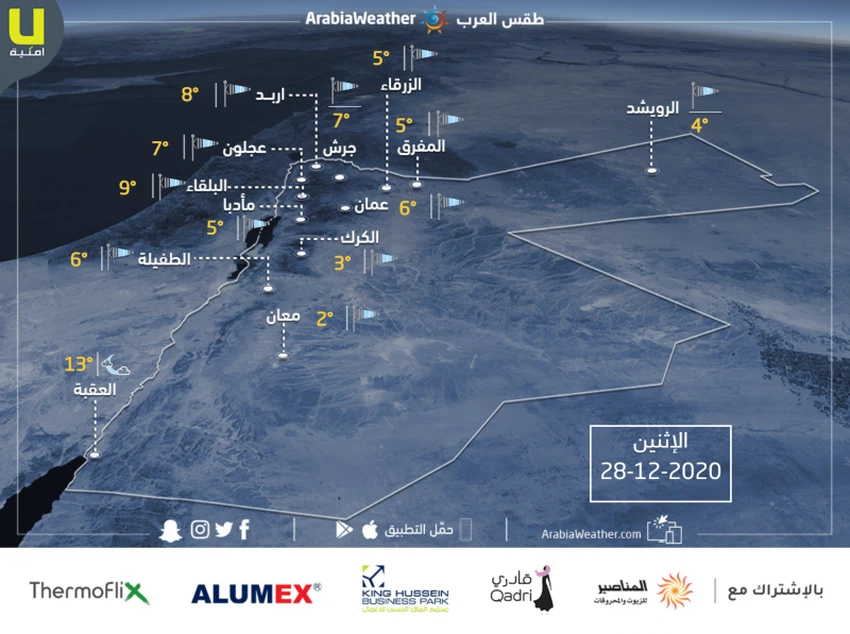 يستمر الطقس شديد البرودة في مناطق عِدّة من المملكة، ويُحتمل تشكل الصقيع اثناء الليل المتأخر وفي ساعات الصباح الباكر في اجزاء من البادية والمرتفعات الجنوبية.