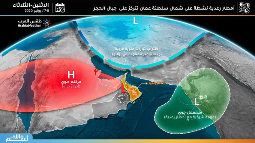 طقس العرب - سنان خلف - تتأثر سلطنة عُمان هذا اليوم الإثنين ويوم غدٍ الثلاثاء بأحوال جوية غير مستقرة، إذ يُتوقع أن تتكاثر السُحب الركامية الرعدية على مرتفعات جبال الحجر والمناطق المُجاورة لها.