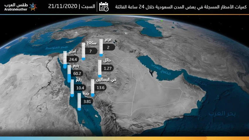 طقس العرب - تأثرت المملكة العربية السعودية خلال اليومين الماضيين بحالة من عدم الاستقرار الجوي هطلت على إثرها الأمطار والتي كانت غزيرة أحيانًا وخاصة على سواحل البحر الأحمر
