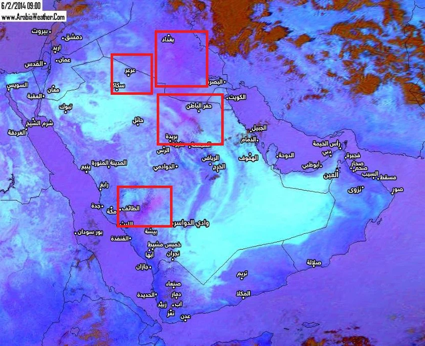 وتظهر صور الأقمار الصناعية الملتقطة 12 ظهرآ بتوقيت مكة موجة من الغبار تضرب شمال السعودية و العراق و المتوقع إندفاعها نحو وسط و شرق المملكة في وقت لاحق من يوم الإثنين.