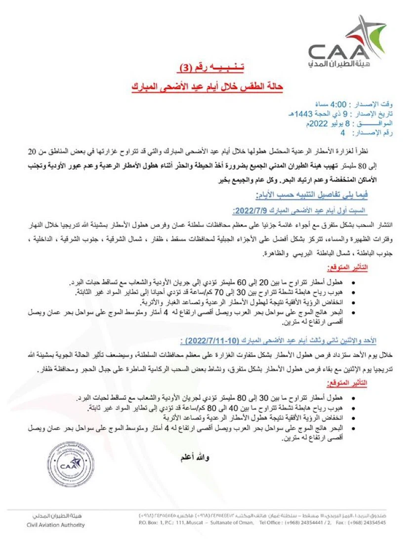 Météo arabe - - Le Centre national d'alerte multirisques du Sultanat d'Oman a émis une nouvelle alerte concernant l'impact d'une nouvelle vague de fortes pluies dans de nombreux gouvernorats des États du Sultanat pendant l'Aïd Al-Adha, et ce qui suit est le texte de l'alerte :